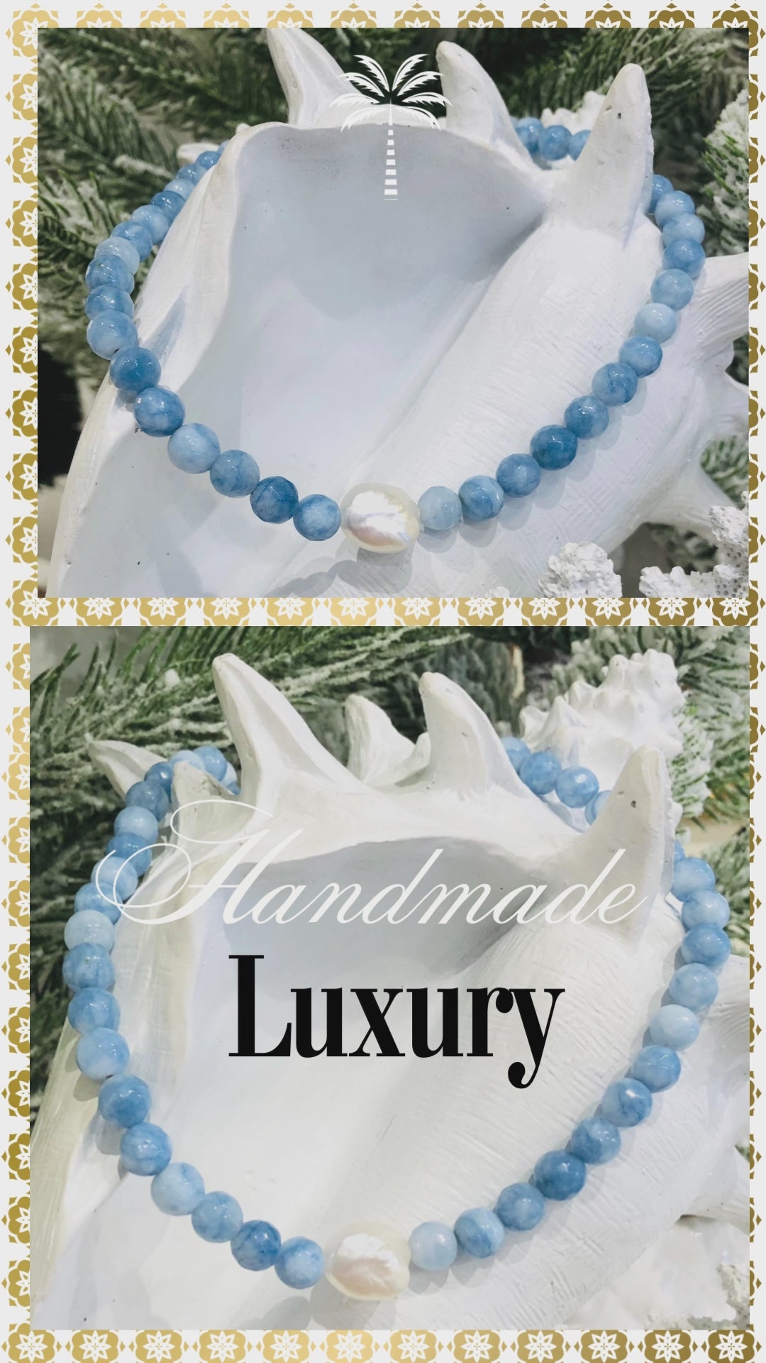 This exquisite necklace is handmade with genuine blue faceted agate stones and baroque pearls, creating an opulent and luxurious necklace you won't find anywhere else. Transform your look with this sophisticated statement piece that exudes elegance and refinement. Necklace measures 18 inches